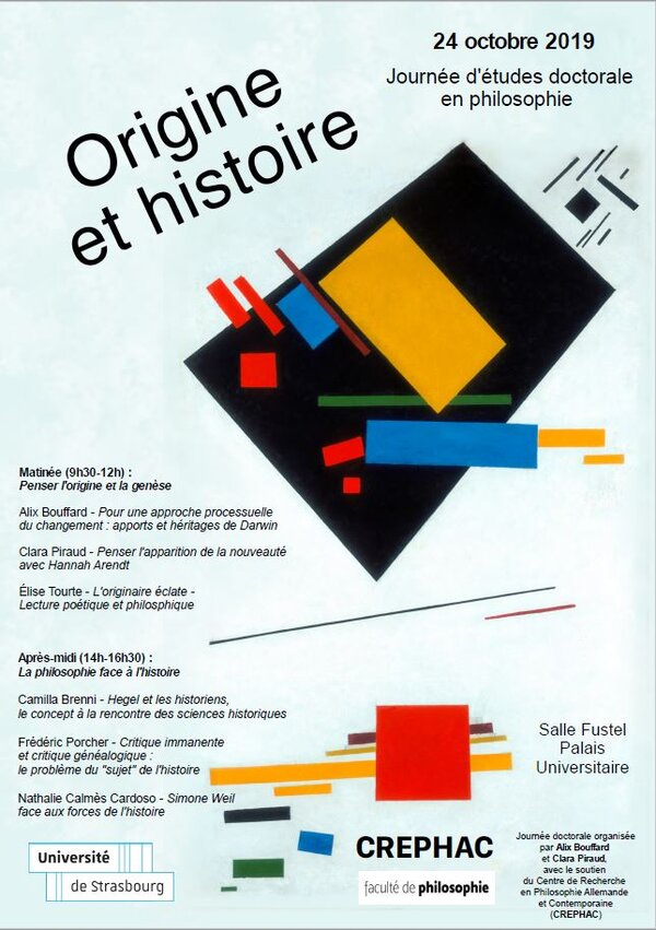 Le lundi 4 novembre La Fondation du Judaïsme Français organise la 7e nuit de la philosophie strasbourgeoise sur le thème "Vérité et mensonges" Flyer Attention, cette manifestation n'étant pas organisée par le CREPHAC, elle ne pourra pas être prise en compte pour la validation de l'UE colloque ou…