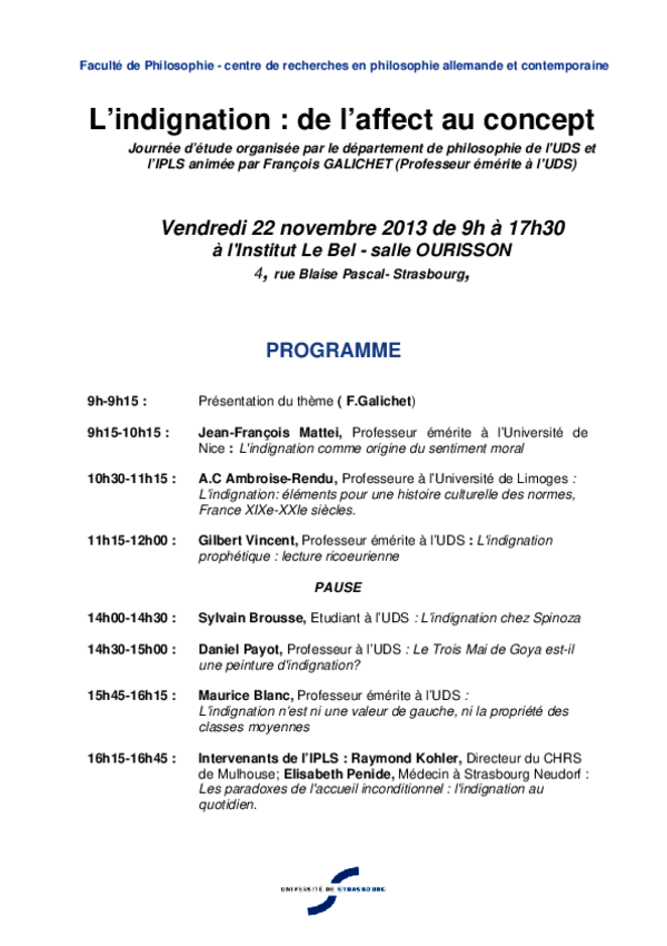 22 novembre 2013 Journée d'étude organisée par le département de philosophie de l'UDS et l'IPLS animée par François GALICHET (Professeur émérite à l'UDS)