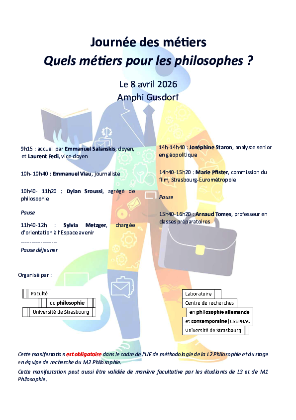 Cette manifestation est obligatoire dans le cadre de l'UE de méthodologie de la L2 philosophie et du stage en équipe de recherche du master philosophie (recherche et enseignement).