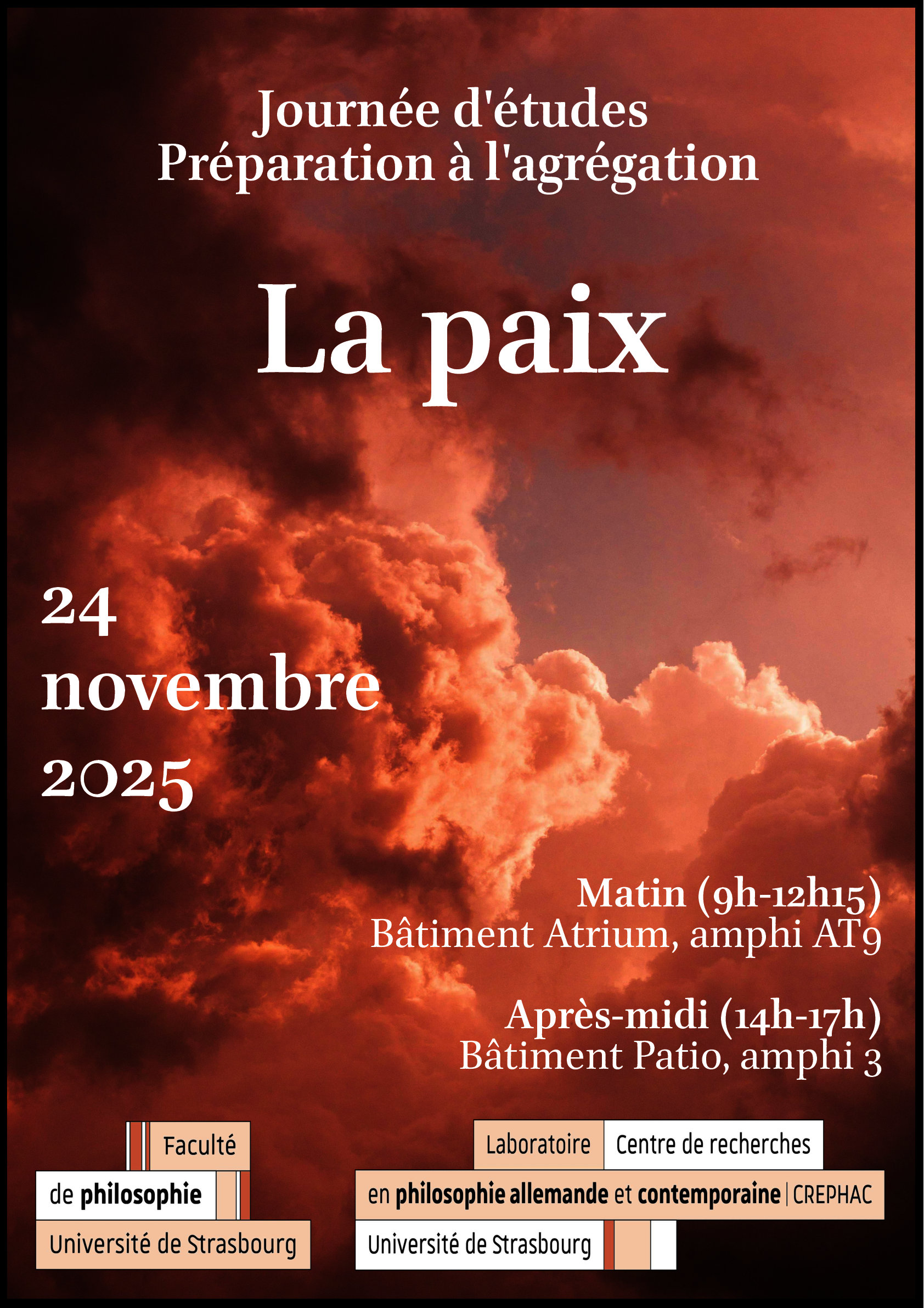 Journée d'études pour l'agrégation : La Paix Journée d'études Descriptif à venir 24 novembre 2025 Cette manifestation peut être validée dans le cadre du stage en équipe de recherche du master recherche en philosophie