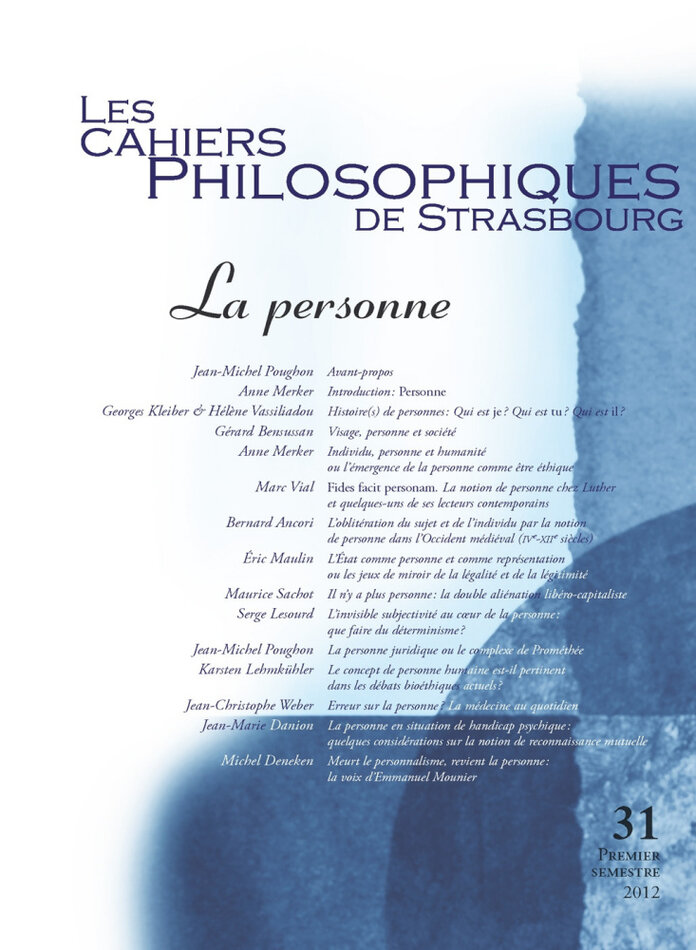 « Introduction : Personne », in : La personne, Actes du colloque interdisciplinaire de l'Université de Strasbourg des 21-22 octobre 2010, réunis et introduits par A. Merker, avec un avant-propos de J.-M. Poughon, Les Cahiers philosophiques de Strasbourg, 31, premier semestre 2012, p. 11-21.